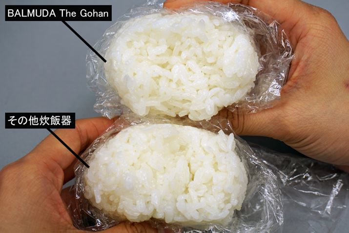 お弁当同様に、おにぎりもほぐれる感がばっちり。一般的な炊飯器でも同じようにおにぎりを作ってみたのですが、中央部分の米粒はくっついています。いっぽう「BALMUDA The Gohan」のごはんで作ったおにぎりは、粒の形がすべて見え、その見た目どおりの食感が口の中に広がりました
