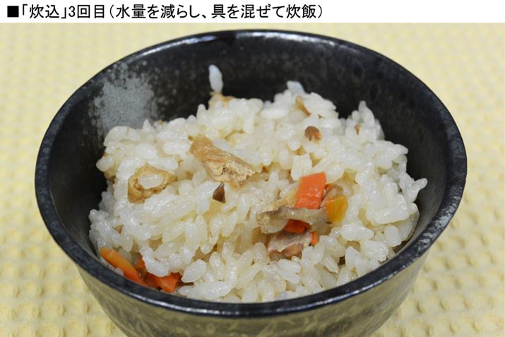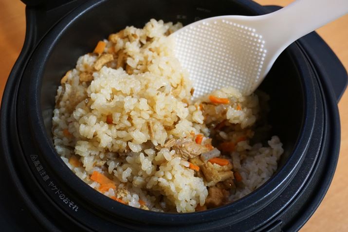 水を減らし、炊き込みごはんの素をきちんと混ぜてから炊飯した炊き込みごはんは、釜めしのような食感になりました