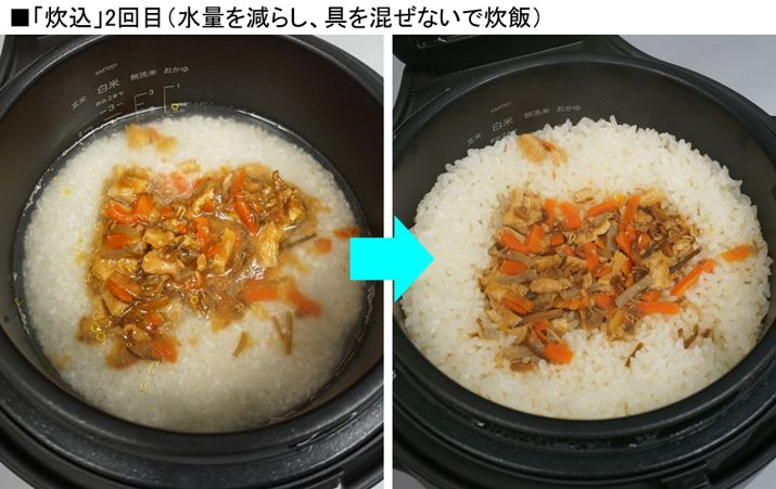 やわらかいならば、水を減らせばいい! と、水量を40cc少なくしてみました。さらに、対流が起こらない炊飯方式なので、水の部分に油が混ざらないほうが均等に熱が伝わるのでいいのではないか……という案を採用し、炊き込みごはんの素をかき混ぜないで2度目の炊飯にチャレンジ