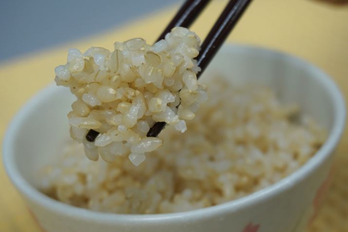 上記の炊き込みごはんと同様の現象が起こったのが、玄米です。普通に炊いても問題はないのですが、「BALMUDA The Gohan」で炊くのだからもっと粒々として欲しい! ということで、炊き込みごはんの成功例にのっとり、水量を40cc少なくして炊いてみました。