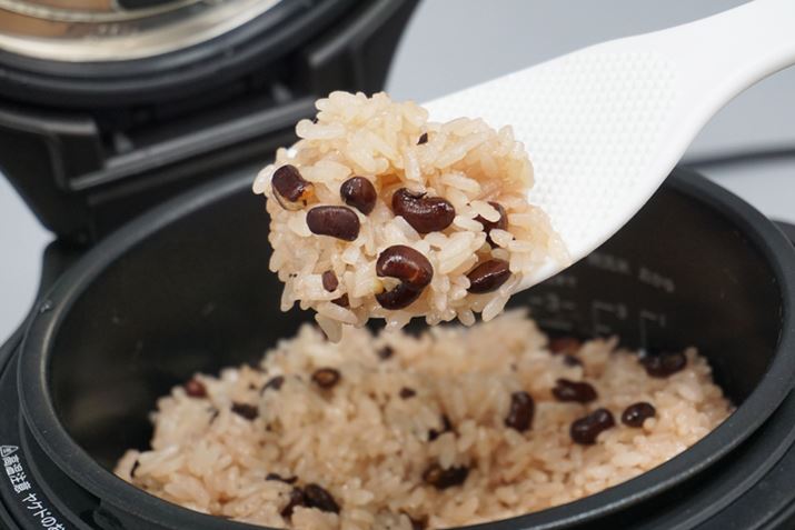 上で紹介していませんが、蒸気を使った炊飯方式のおかげか、赤飯の仕上がりは最高でした! もち米との相性はよさそうです