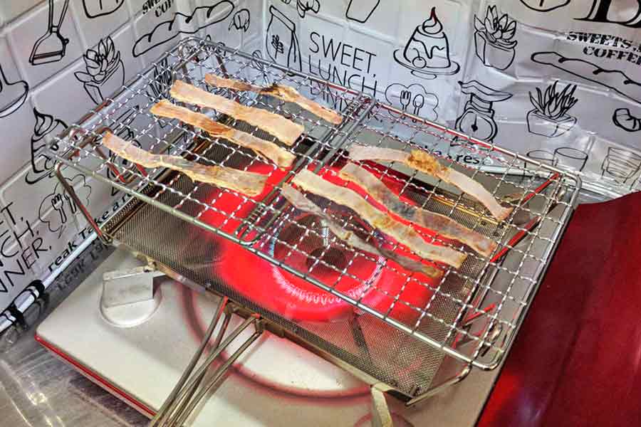 試しに、アウトドア用のカセットコンロを使って普通の焼き網で焼いてみました