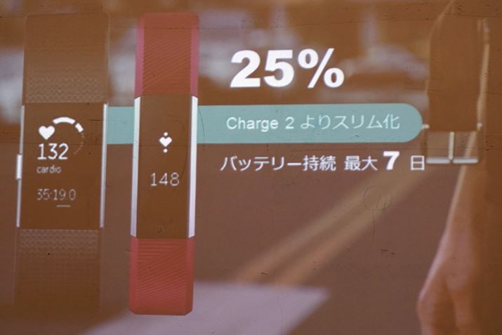 発表会時のスライド。左が「Fitbit charge 2」で、右が「Fitbit Alta HR」だ。「Fitbit Alta HR」は実測値で幅が約1.55cmというスリムさに