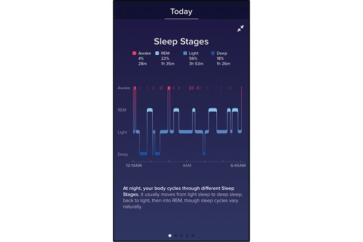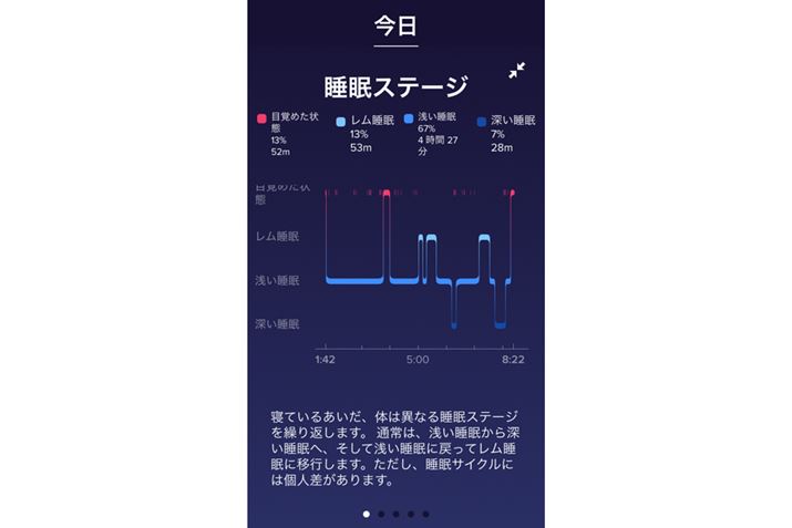 「Sleep Stage(睡眠ステージ)」は、「Fitbit Alta HR」と連携するアプリ「Fitbit」の機能のひとつ。睡眠の深さやレム睡眠といった睡眠状態を分析できる。まず感じたのは、自分の睡眠状態をグラフで見ることが新鮮だということ。また、着けたまま寝ると自動的に入眠したことを感知して計測を開始してくれるのも便利だった。筆者の場合、起きた実際の時間と計測時間にズレがなかったため、入眠した時間もほぼ正確なのであろう。