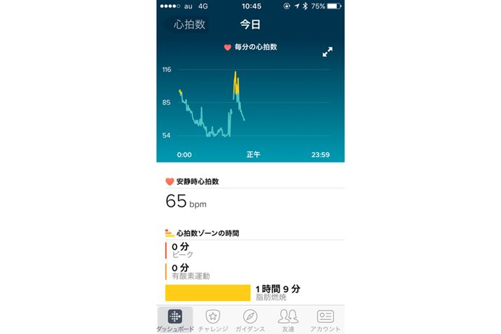 深夜0:00から10:45までの心拍数の動き。グラフ表示なのが見やすい。グラフが途中で切れているのは、本機が生活防水機能しかないために、朝、シャワーを浴びる際に外したから。黄色は前述の「脂肪燃焼ゾーン」を意味し、時間帯的には通勤時の心拍数。「脂肪燃焼ゾーン」まで脈拍が上がっていることがわかる