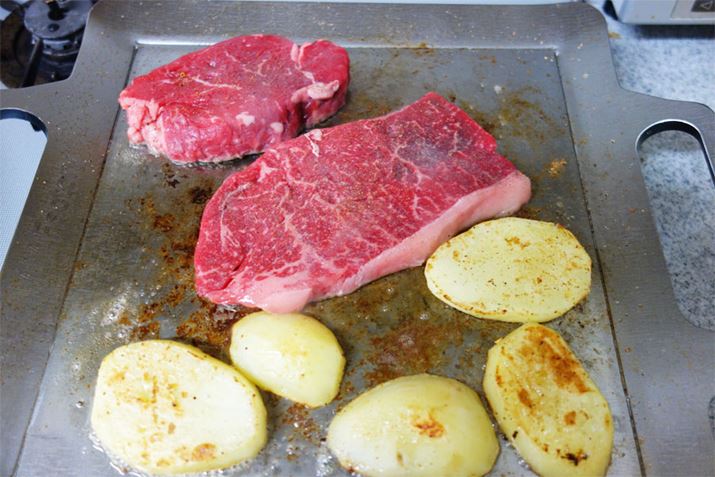 火の準備についてはこのあたりにしておいて、いよいよ食材を焼く時間です! BBQ会場に備え付けの網や鉄板もいいですが、もっとおいしく焼ける鉄板を使ってみたくありませんか? それがこちらの「極厚鉄板」。なんと9mmもの分厚さでできているため、熱が均等に蓄えられ、食材に効率よく熱が伝わるようになっています。分厚いお肉も外はカリッと、中はふっくらジューシーに仕上がって…モ〜たまりません!