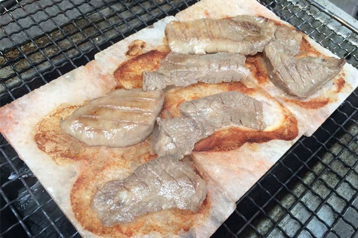 もう少し手軽にワンランク上のBBQを楽しみたいなら、“岩塩焼き”にチャレンジしてみるのはいかがでしょう? LOGOS (ロゴス)の「岩塩プレート」があれば、食材を乗せて焼くだけでいつもと違う味になります。天然の塩の塊をプレート状に削り出したアイテムで、焼いている間に岩塩から良質のミネラルが溶け出し、絶妙な塩味になっていくんです! 試しに牛タンを乗せて焼いてみると、しっかり“タン塩”になっていました。BBQに持って行けば注目されること間違いなし♪