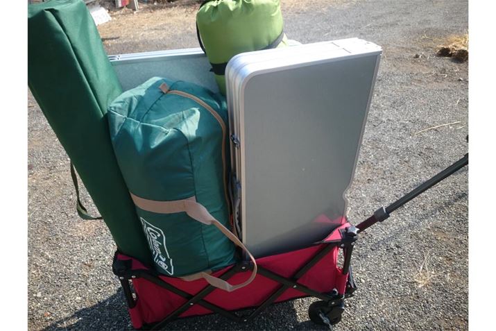 楽しかったBBQも終わり、使った用具や荷物をまとめたら、「ファミリーマルチキャリー」に入れて運べばラクチンです。写真は、4人用のテント、簡易ベッド、マット2種類、テーブル2種類を入れたところ。腕に抱えて運ぶなんて到底無理なボリュームですが、80kgまでOKなこのキャリーなら安定して引っ張っていくことができました。これは頼れる!