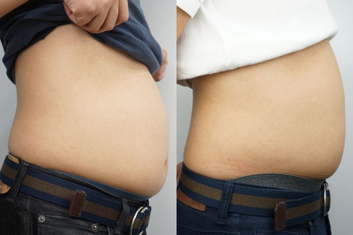 左が使用前で、右が1か月の使用後。全体的に腹まわりのふくらみがしぼんだように見え、ズボンにのっかていたお腹も多少スリムになっている! 背中にあった肉でできた“くびれ”もなだらかになった
