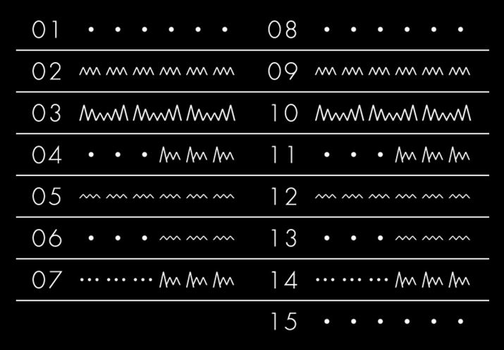 電気刺激プログラムの一連の流れ。01〜15のパターン(01〜07が1セット目、08〜14が2セット目)が数分ずつ続けて行われる