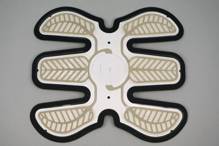 まずは、「EMSエクサパッド」の使い方から。といってもほとんどすることはない。同梱のジェルパッド6枚を下記の写真のように本機の裏側に装着して、あとは約1mのぽっこりお腹に貼るだけだ。