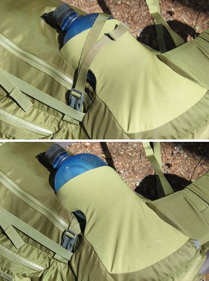 サイドのポケットは、密が細かいメッシュ地となっている。伸縮力がとても高いうえに深さもあり、内部のものを落としにくい。そこに付けられたストラップはポケットの外側にも内側にもまわすことができ、ギア類のキープ力を向上させている