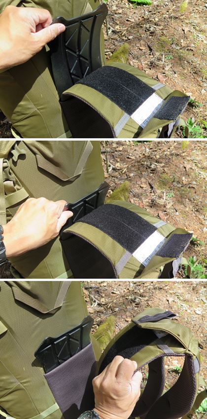 わずかに湾曲した黒い樹脂製パーツは「フレームシート」。フレームシートはバックパックを背負っている時に、ちょうど背中から肩のラインに沿う場所に格納され、この曲線によって背面パッドを体にフィットさせる。また、背面長の調節の際は、ベルクロを引きはがすための板として利用される(使用方法は下の写真を参照)