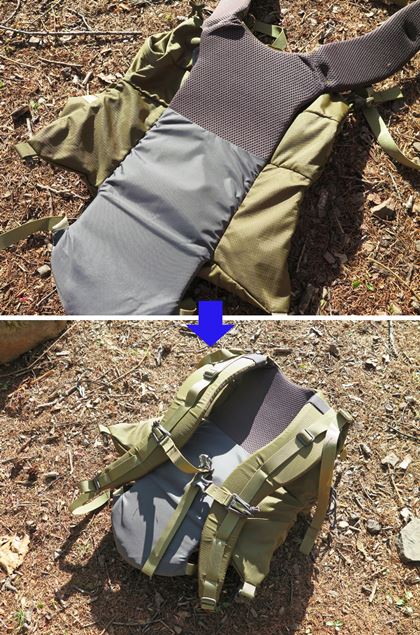 実際に、ヨークを雨蓋に組み合わせてみよう。雨蓋の裏のスリットにヨークのパッドの末端を差し入れ、その後、各部のストラップをバックルに通す。すると、スタイン62の一部のパーツだけで、完璧なバックパネルを持つ小型バックパックが生まれる