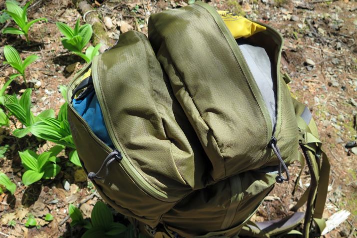 リッド(雨蓋)のポケットは2つに分かれ、どちらもかなりの容量。体に近いほうに水などの重いものを入れ、遠いほうに行動食などの軽いものを入れると重心が体に近くなり、背負いやすくなるはずだ