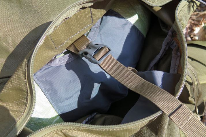ボトム部分のバックルを外すと、その下にファスナーが現われる。これは、開口部を大きくするために本体の幅以上に長いファスナーを取り付け、荷物を取り出しやすくするための工夫だ。反対に、収納時はバックルを留めてからパッキングを進めたほうが、きれいに収まる