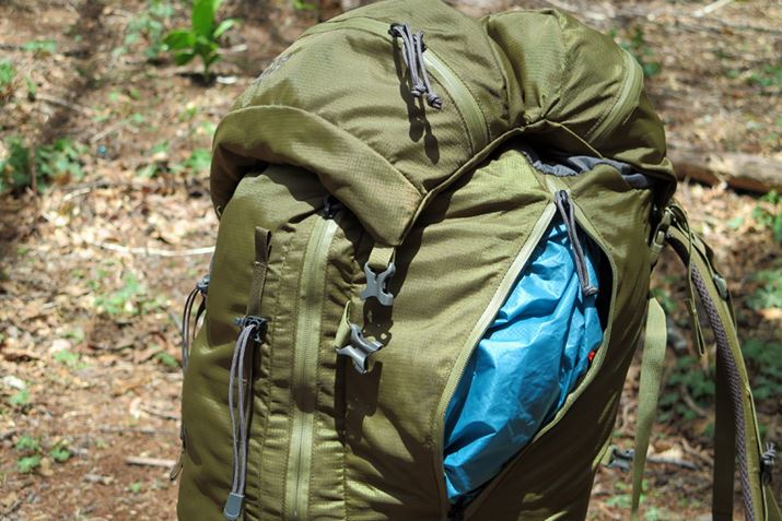 サイドにも長いファスナーがあり、この部分からも荷物を取り出し可能。スタイン62の外部から見える部分のファスナーはすべて止水タイプで、内部への雨水の浸透を最低限にとどめてくれる