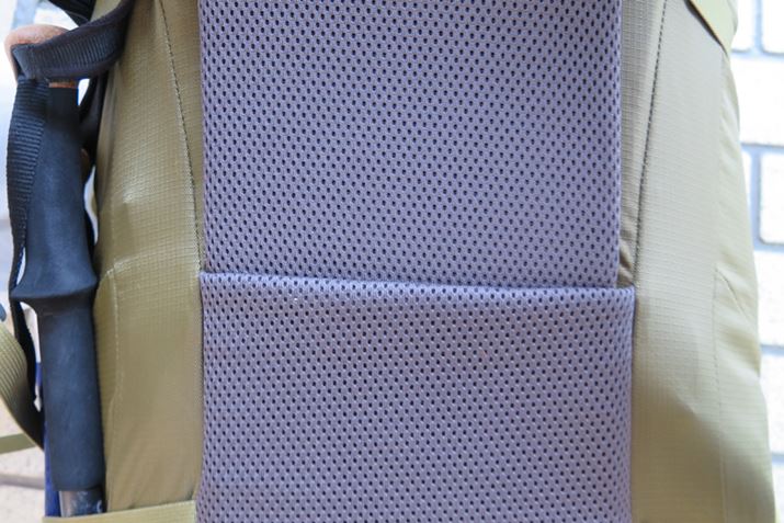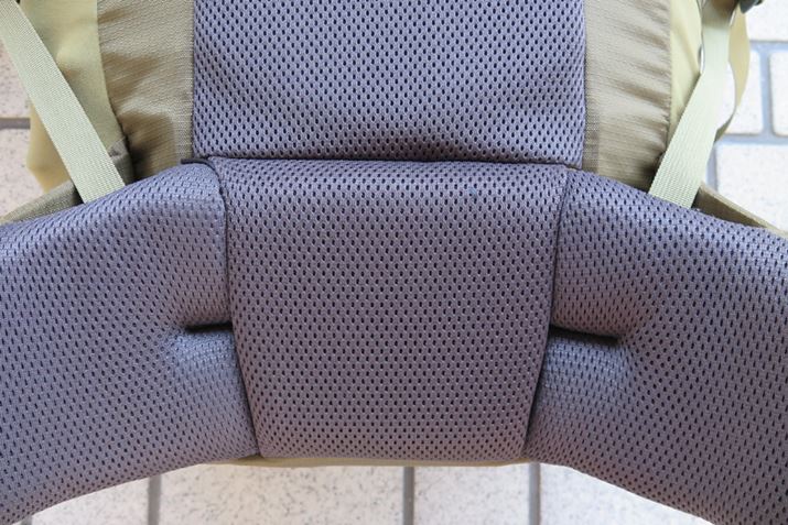 背面の中央にあるラインの上は可動するヨークで、その下部はスリット状になったバックパック本体の隙間に押し入れられている。つまり、ラインより上の部分の長さによって背面長が変わるということだ。ちなみに、ラインの上下で平行に見えないのは、メッシュ生地が無用に斜めにズレて縫製されているため。工場生産品でもこのような「個体差」が出るのは仕方ないのかもしれないが、調整の妨げにつながる「目の錯覚」を引き起こすので、改善を望みたい