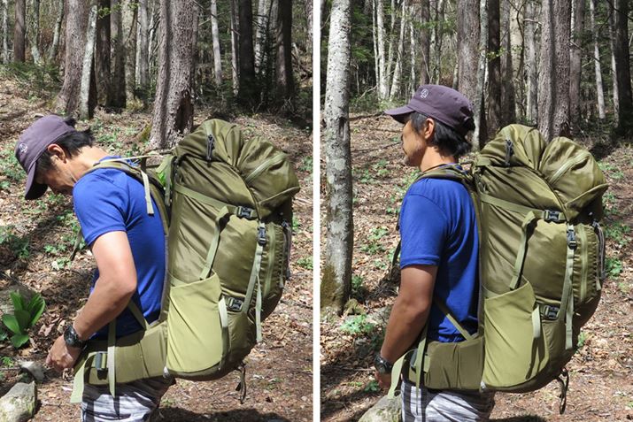 左は背面長の調整を終えつつも、その他のストラップを引いていない状態。その後、各部のストラップを締めていくと、右のような姿に。このようにフィッティングを終えると、背面とウェストのパッドが体になじみ、荷物が本来の重量よりも軽く感じられる