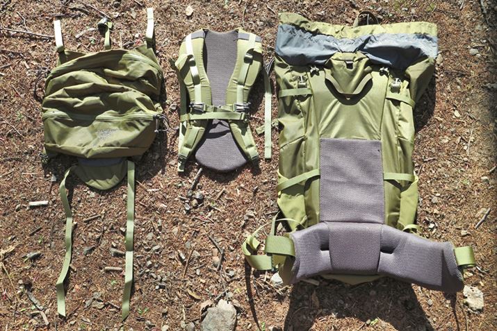 左が雨蓋、中央がヨーク、右がヨークを外したバックパック本体。ヨークをバックパック本体に合わせれば本来の大型バックパックになり、ヨークと雨蓋を組み合わせれば小型バックパックになる。非常に面白い工夫だ