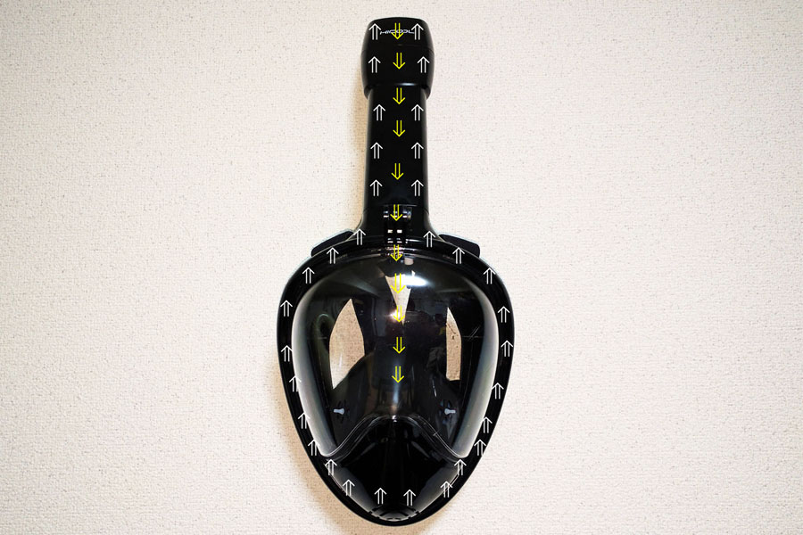 吸いこんだ空気は中央から(黄色い矢印)、吐いた息は側面を通り排出(白い矢印)される仕組みです。ですので、レンズが曇りません!