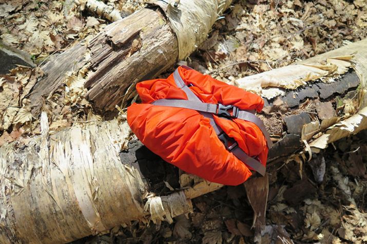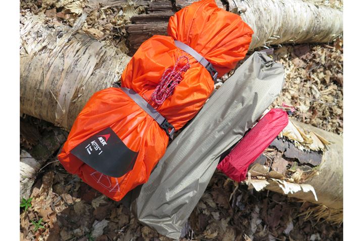 インナーテントとフライシートを入れたスタッフバッグを圧縮した状態。日本のテントメーカーであれば、テントを収納させるスタッフバッグは、過不足なく入る大きさのものを付属させるが、多くの海外メーカーは、あまりキッチリとテントを畳まないでも収められるようにスタッフバッグのサイズに余裕を持たせている。だから、アクセス1もスタッフバッグはかなり大きく、ストラップなどで圧縮すれば手のひらに乗せられるほど小さくなる