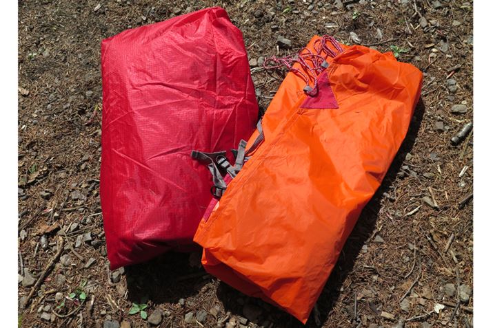 インナーテント(左)のフロア部分には耐久性が高い30デニールリップストップナイロンが用いられ、フライシート(右)は一般的なテントよりも非常に薄い20デニールリップストップナイロンが使用されている。そのために、畳むととてもコンパクトになる