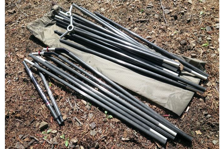 ポールは大きく分けて、2本。そのうちの1本はテントを立体化させる際のメインポールで、2か所のハブによって末端は4つに分かれ、テントを自立させる。このポールはハブによって連結しているだけで、長いもの1本と短いもの4本で、計5本と数えることもできなくはない。また、もう1本はテントの前後にまわり、テントの壁を垂直気味に立ち上げると同時に、広い前室を生み出す