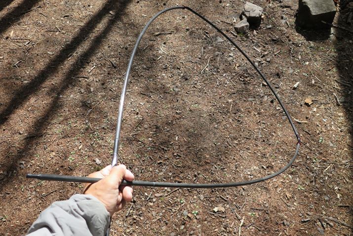 これくらい曲げても、まったく問題はない。実際の山ではこれ以上にテントのポールが曲がる状況は考えられず、よほどの悪条件でなければ、破損はしないはずだ。しかし、あまりに弾力性が高く、鞭のようにしなるために、この状態から手を離す時は少々怖かった
