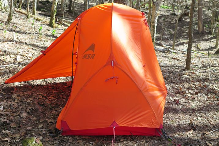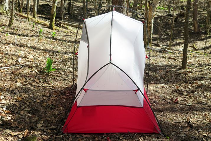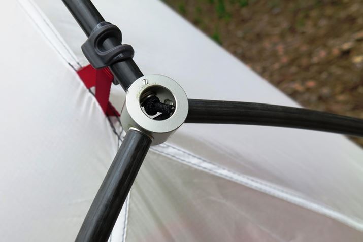 MSRの山岳用テントの特徴は、数本のポールを連結するハブの使い方にある。同社の多くのモデルでは正三角形を描くように3本のポールをハブに配置し、できるだけ短いポールで広い空間を生み出すようにテントを立体化させる。その点は、このアクセス1も同様である。
