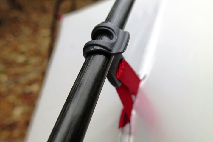 ポールとインナーテント、フライシートとの連結は、ポールの末端を両者のリングにかけるだけ。設営作業も簡単だ