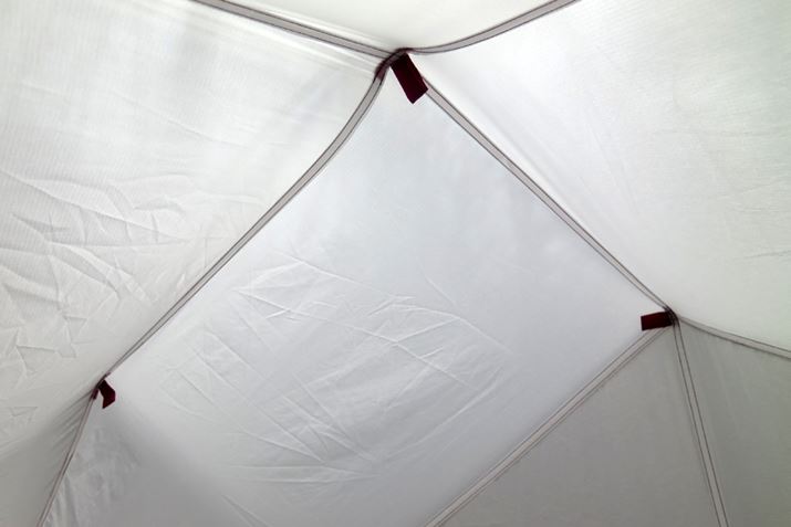 乳白色のインナーテントの天井部分には小さなループがいくつか取り付けられており、ここに細いロープを自分で渡せば、物干しのようにも使える