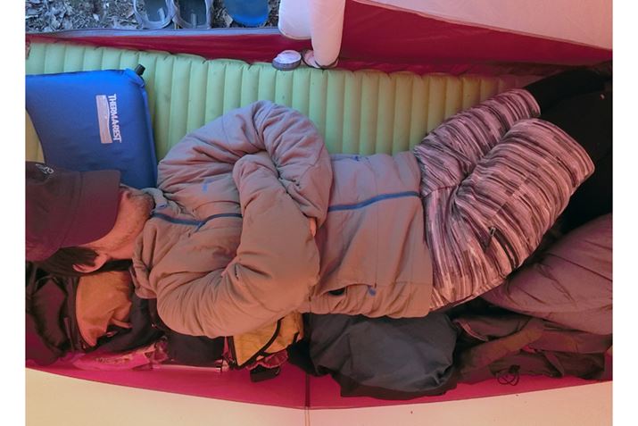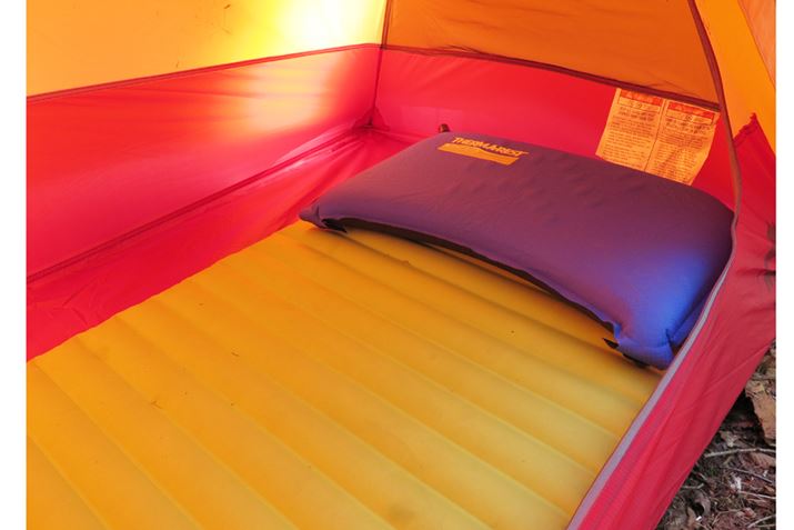 枕を置いているのでわかりにくいが、頭上にも余裕がある。広いとは言えないが、必要十分なサイズ感であり、テントをできるだけ軽量に作るためには理想的な大きさだ。フロアの大きさは84(幅)×104(高さ)×213(長さ)pで、マットを敷くと、その横に30pほどの荷物置きのスペースができる。同様に横になった際、頭の上に30p程度のスペースが空く。1人分の荷物を収納するのには困らないはずだ