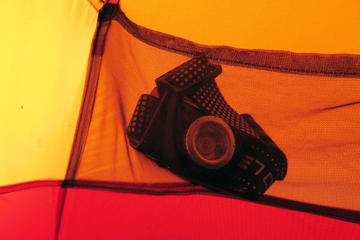 頭と足元にはそれぞれメッシュのポケットが付き、細かな道具を入れられる。幅が60p近くあるため大量にモノを入れることができるが、入れすぎるとその重さでテントがゆがみ、浸水などの恐れが出てくるので適度な使い方にとどめたい