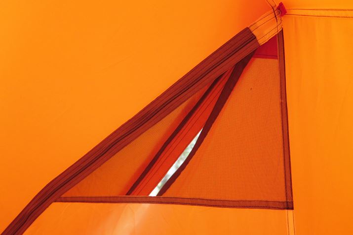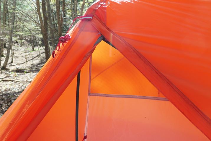 フライシートはオレンジ色で、発色がかなりいい。夏の緑の中では非常に映え、冬の白い雪の中でもとても目立つ。しかしインナーテントは白っぽいので、内部に入ってしまえば柔らかなオレンジ色になり、それほど強烈な色には感じない