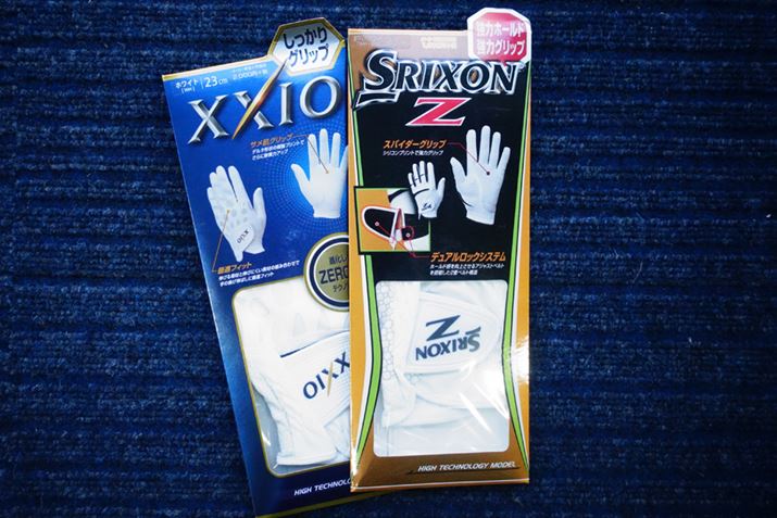 ダンロップのゴルフグローブ、XXIOゴルフグローブ GGG-X01(左)と、SRIXONゴルフグローブ GGG-S020(右)。前者は伸びる素材などを使って快適な装着感を、後者は掌に工夫をこらし、より滑りにくくなる工夫が施されています