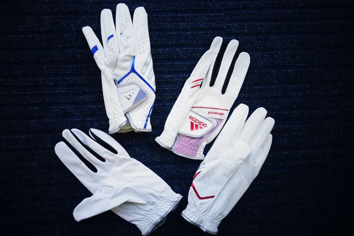 アディダスのゴルフグローブ、「アディフィット ノンスリップコンフォートグローブ」(左)、「クライマクール 17グローブ」(右)。前者はサッカーシューズのアッパー用に開発された素材をさらに特別加工し、雨天でも快適なグリップが得られるように開発されました。後者は優れた通気性と冷感機能を装備した夏にピッタリ