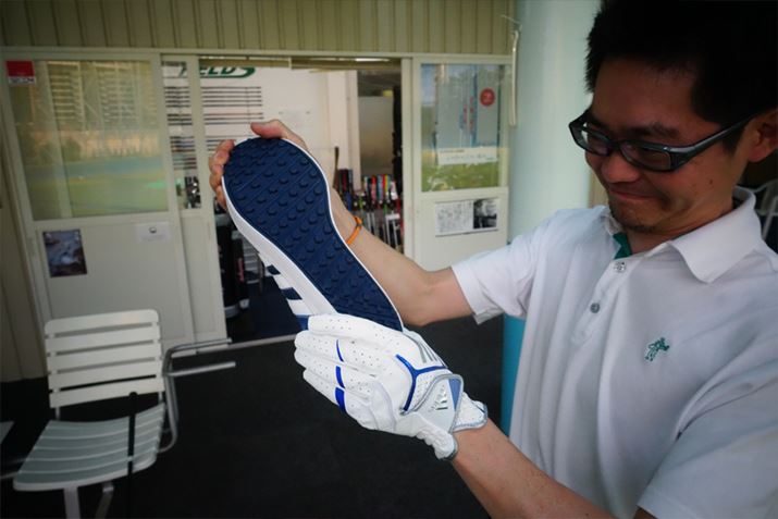 このスパイクレスタイプのゴルフシューズ、スニーカーやランニングシューズと何が違うかというと、ソールが硬めにできています。ゴルフのスイングは、足を踏ん張り、体を捻転させてスイングするので、靴にものすごい捻(ね)じれの力がかかるのです。それでいて滑らないようにしなければならないので、底の形状でしっかりと地面に食いつき、捻じれの力がかかっても壊れないようになっているんですよ。