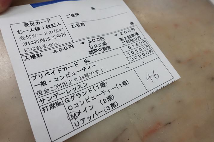 打席は自由に選べる場合と指定される場合があります。写真は指定されたときのパターンで、「2階の46番打席」を意味しています