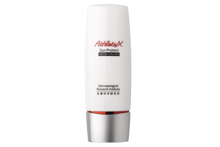 AthleteX 「サンプロテクト50+」は、アスリート向けに開発されたウォータープルーフタイプの日焼け止めです。汗に強い独自製法のパウダー配合で、べたつかない使用感。メントール配合なのでひんやり感も得られます