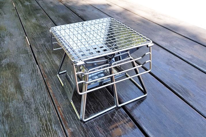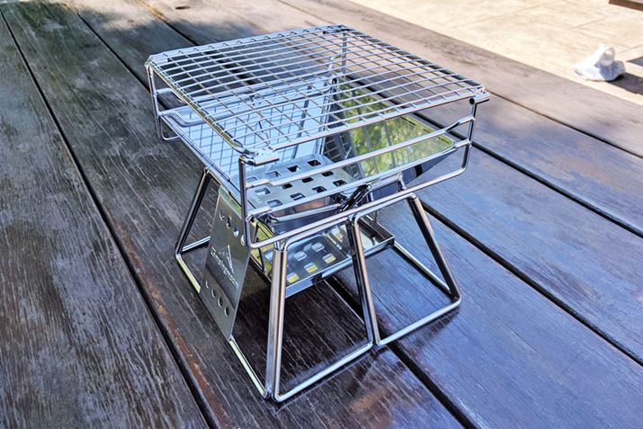 これはCAMPINGMOONというメーカーのミニBBQコンロ兼焚(た)き火台で、世界最小とうたわれています。高さが最大で約20cm。横幅、奥行きは共に約19cmです。世界最小と聞くと、イメージ的には焼き肉の肉ひと切れが乗るか乗らないかくらいの大きさを想像してしまうかもしれませんが、そういったミニチュアレベルの鑑賞用の世界最小ではなく、しっかりと肉や魚を焼くことができる実用レベルの世界最小といった感じです。