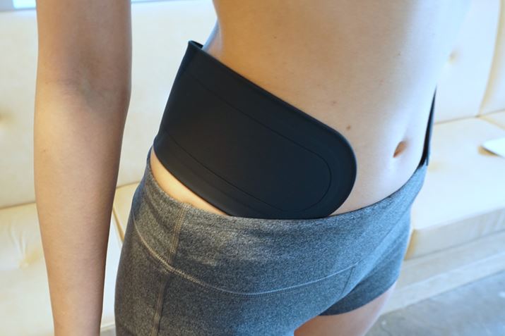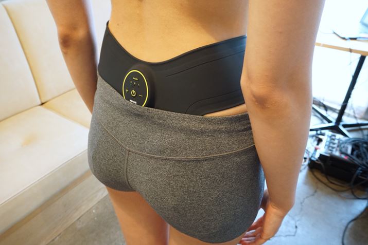 「もてケア ウエスト&ヒップ」は、電源及びコントローラーを本体に内蔵した薄型のコードレスタイプで、背面からおへその横まで貼り付けられる。また、薄くてやわらかいシリコン素材を採用し、身体にフィットしやすい