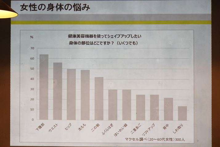 20〜60代の女性300人に聞いた「女性の身体の悩み」(日立マクセル調べ)。2位のウエストと3位のヒップを同時に鍛えられるEMS機器は、いままでなかった