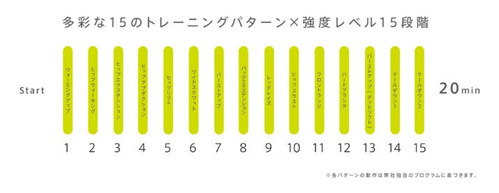 「もてケア ウエスト&ヒップ」のトレーニングパターン。15個あるステップはそれぞれ刺激の種類が異なり、1つひとつのステップの中でも何種類もの「リズム(周波数)」が流れる仕組みだ。それにより、筋肉の慣れを防ぎ、引き締めを効果的に行う。1回のトレーニングは自動切り換えのオート仕様で、20分後に自動的にオフになる