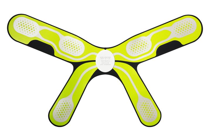 本体裏側には、電気刺激を流す6つの電極部を骨盤位置に考慮して配置。それぞれにゲルパッドを装着して使用する。サイズは580(幅)×340(高さ)×17.4(厚さ)mmで、重量は約170g。形状やサイズは膨大な体型データをもとに研究されており、本機は体型を選ばずにフィットするという。また、コントローラーの裏側(写真中央部)はフラットになっており、装着時の違和感を軽減した