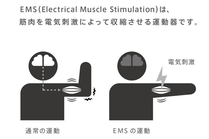 通常の運動は、脳から送られる電気信号を筋肉が受けて動く。一方、EMS運動は、EMS運動機器から直接筋肉に電流を流して筋肉を動かす。その利点としては、疲れず楽にトレーニングが行えるうえ、筋肉を傷めにくく、またバランスよく筋肉を動かせることなどがあげられる