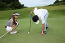 まずグリーンに上がったら、自分のボールがグリーンに落ちた際のへこみ「ピッチマーク」を直します。このときに使うのが、「グリーンフォーク」です。文字どおりフォークのようになっていてピッチマークの外周に刺し、中心に向かって寄せるようにへこみを埋めていきます。ある程度寄せたら最後はパターで軽くたたき、平らにして終了。キャディさんがいても自分で積極的に直しましょう。
