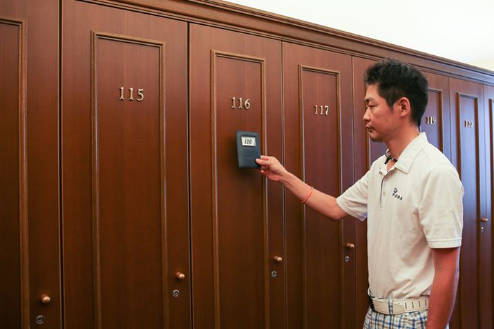 ゴルフ場には、必ずといっていいほど貴重品ボックスがあります。プレーに必要のない貴重品はこれに預けましょう。暗証番号や指紋で開け閉めするタイプがほとんどです。最近はカードホルダーにICチップが内蔵されていて、ホルダーがないと暗証番号や指紋認証だけでは開かないようになっているケースが多いですね。