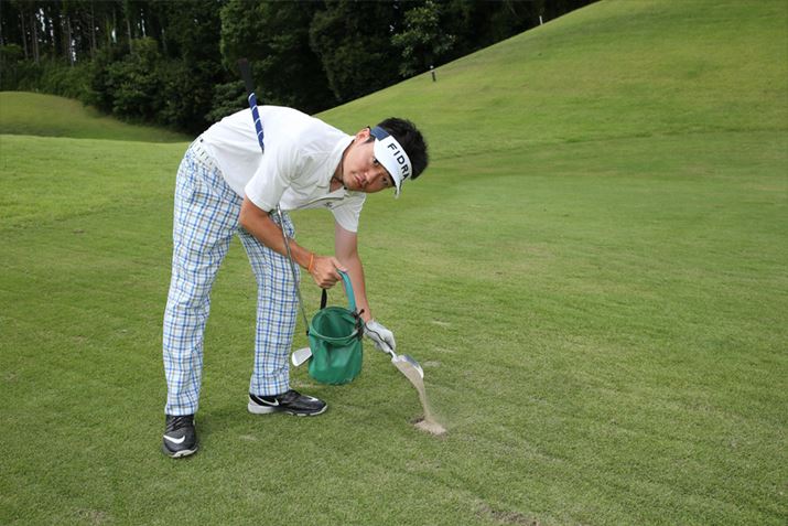 キャディさん付きのプレーの場合は、キャディさんが埋めてくれるので自分でやる機会はほとんどありませんが、PAR3のティーショットなどでは、ティーインググラウンドなどにも目土が用意されているので、自主的に目土を施せるようになるとゴルフ場にもやさしいカッコイイゴルファーになれます。