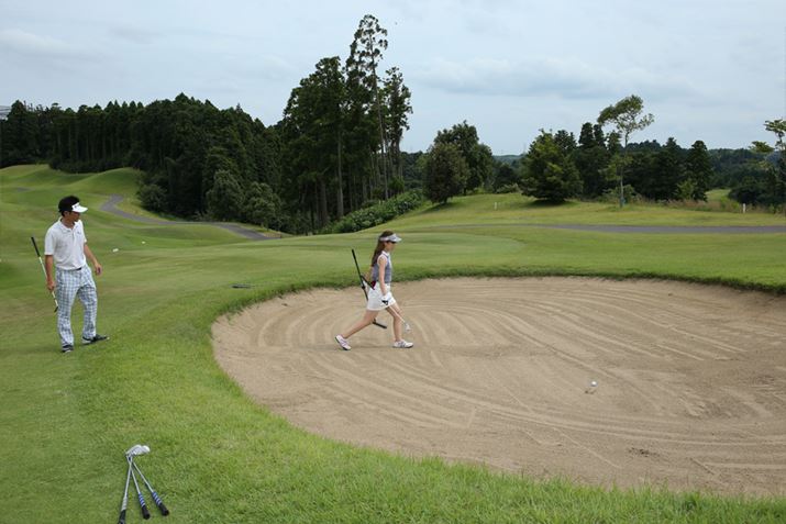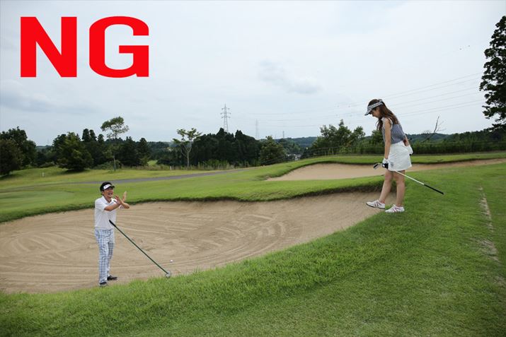 高いところからバンカーに入ろうとするとバンカーの土手を破壊したり、怪我したりするもと。絶対にやめましょう
